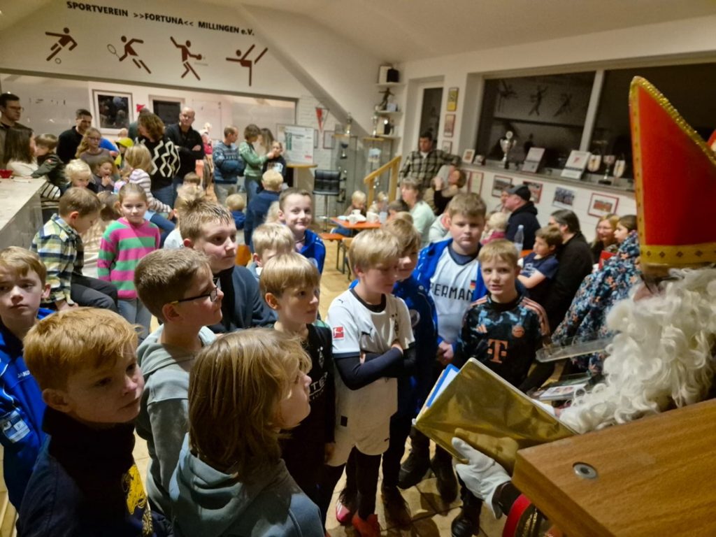 Nach der Sammelaktion in Bienen fand im Vereinsheim Millingen die traditionelle Nikolausfeier der E-Jugend, F-Jugend und Bambinis der JSG statt. Das Vorbereitungsteam Petra Baumann, Torsten Neek, Udo Lensing und Matthias Beenen hatte Einladungen verschickt, Kuchen und Plätzchen organisiert und das Vereinsheim weihnachtlich dekoriert. Nach einer kurzen Begrüßung wurde dann in gemütlicher Runde bei Kaffee und Kuchen, den die Eltern der Fußball-Kinder mitgebracht hatten, erzählt. Und auch in Millingen waren die Kinder aktiv: an vorbereiteten Stationen konnten die Kinder ihr Geschick zeigen, dabei Punkte sammeln und auch noch Preise einheimsen. Als Höhepunkt für die Kinder erschien dann der Nikolaus, den die Kinder mit einem Nikolauslied begrüßten. Der Nikolaus fasste dabei für jede Mannschaft die Höhepunkte der letzten Saison zusammen, zudem gab er den Kindern wichtige Tipps für ihren zukünftigen Einsatz mit auf den Weg. Zum Abschluss der Nikolausfeier gab es für jedes Fußballkind einen Weckmann, und für die anwesenden Trainer noch ein Weihnachtsgeschenk von ihren Kindern. So konnten alle zufrieden nach Hause gehen.